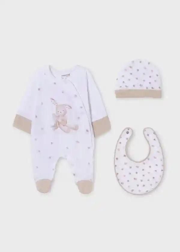 Original conjunto de tres piezas para bebé. Pijama manga larga para bebé. Cierre lateral con botones a presión. Cierre con botones en la entrepierna. Diseño estampado. Dulce gorro para recién nacido.