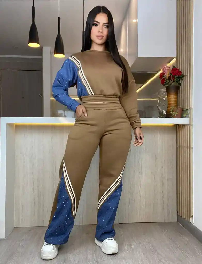 Atrévete a ser diferente con este conjunto que redefine el concepto de athleisure. Destaca por sus innovadores insertos de textura denim con apliques brillantes, creando un contraste único sobre el tono café tierra. El corte entallado en la cintura y la bota holgada ofrecen una silueta moderna y estilizada. Detalles: Mangas y laterales en denim decorado, franjas deportivas en contraste y tejido premium de tacto suave. Color: Café con detalles en denim azul. Estilo: Moderno, audaz y exclusivo.