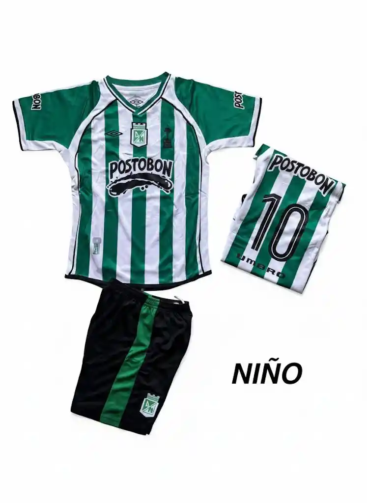 Conjunto Atlético Nacional Rayas Verdes – Niño (Edición Retro) Un clásico que nunca pasa de moda. Este conjunto infantil del Atlético Nacional con diseño de rayas verdes y blancas representa la esencia y el orgullo del equipo más grande de Colombia. Perfecto para los pequeños hinchas que viven y sienten la pasión verdolaga. ✅ Características: Camiseta, pantaloneta y número 10 estampado. Diseño retro con franjas verticales verdes y blancas. Tela liviana, fresca y de secado rápido, ideal para jugar o vestir casual. Escudo y detalles de gran calidad