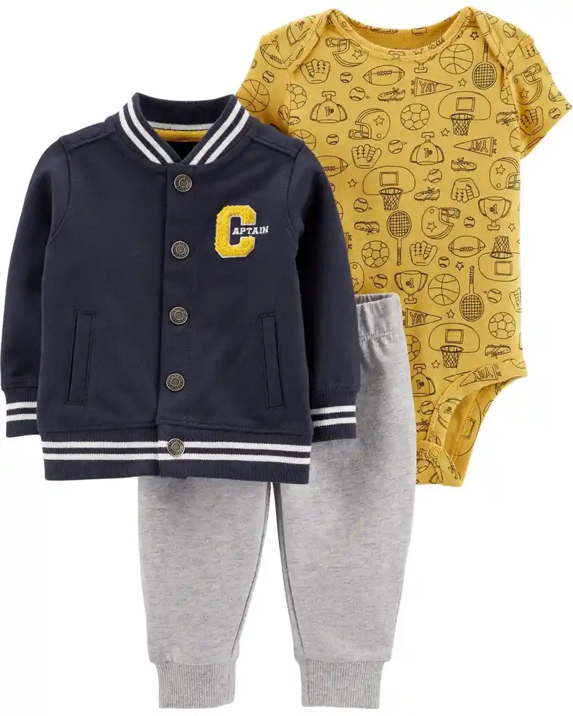 Conjunto marca Carters elaborado en telas suaves y cómodas, ideal para mantener al bebé abrigado con un estilo deportivo y moderno. Este producto incluye: Chaqueta color azul marino tipo varsity con botones frontales y detalle bordado Body color mostaza con estampado deportivo y broches en la parte inferior para facilitar el cambio Pantalón color gris con cintura resortada para mayor comodidad Perfecto para uso diario, salidas casuales o climas frescos, brindando comodidad, calidad y el estilo característico de Carters.