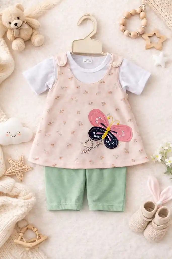 Conjunto para bebé recién nacido niña diseñado para brindar comodidad, frescura y un estilo delicado en el uso diario. Incluye blusa blanca de manga corta, vestido tipo pichi en tono rosa pastel con estampado floral suave y una hermosa aplicación bordada de mariposa, acompañado de short en color verde menta que complementa perfectamente el conjunto. Confeccionado en tela suave y ligera, ideal para la piel sensible del bebé. Su diseño permite libertad de movimiento y es perfecto para climas cálidos o templados. El vestido cuenta con broches en los hombros que facilitan el cambio de ropa, manteniendo al bebé cómodo en todo momento. Ideal para salidas, uso diario o como regalo para bebé niña. Características Tipo: Conjunto para bebé niña Incluye: Blusa, vestido tipo pichi y short Material: Tela suave y cómoda Diseño: Floral con mariposa bordada Colores: Rosa pastel, blanco y verde menta Broches en hombros para fácil colocación Cómodo y ligero Para un bebé recién nacido