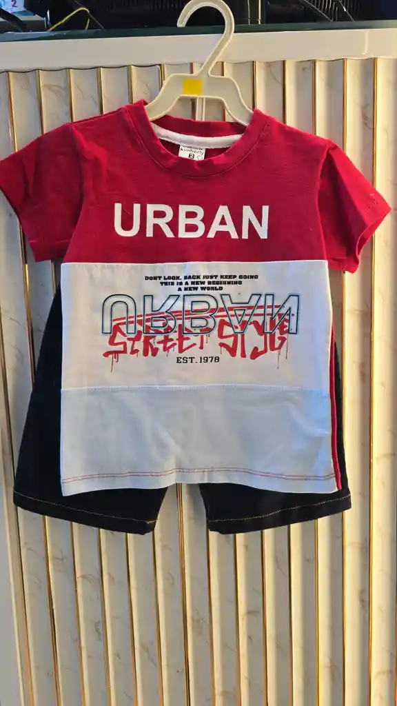 conjunto de 2 piezas, camiseta cuello redondo y bermuda licrada con cordon para ajustar en la cintura con 2 bolsillos frontales. Para niño de 2 a 3 años