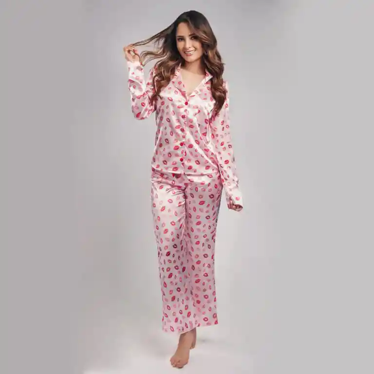 Camisa con botones y bolsillo camisero ·Pantalón con moño decorativo Color rosa. Tela satín Estampado de besos.