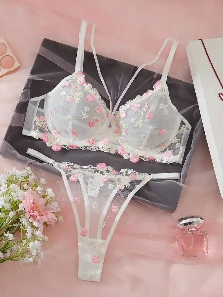 Conjunto Bordado Floral Rosa Hermoso, Sujetador con Aro y Forro Doble Capa Push Up y Tanga, Usable como Prenda Exterior