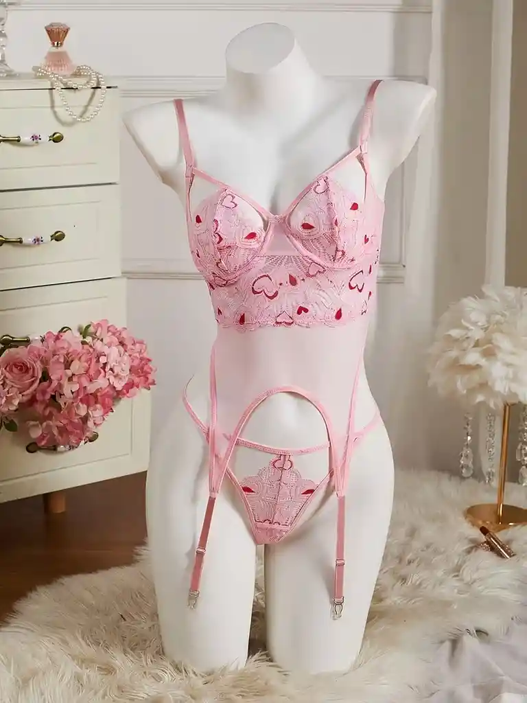 Conjunto Bordado Floral Rosa Hermoso, Sujetador con Aro y Forro Doble Capa Push Up y Tanga, Usable como Prenda Exterior