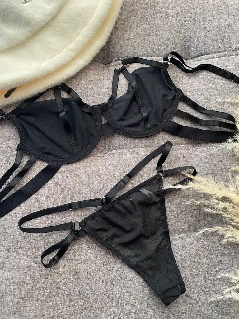 Conjunto brasier con varilla y panty en tanga graduable con escote en el posterior