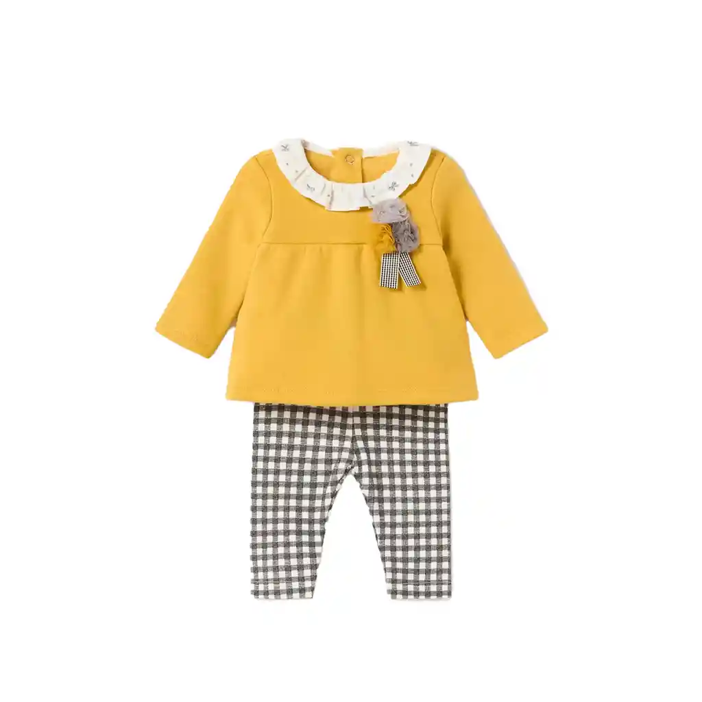 Conjunto de dos piezas para recién nacido compuesto por una camiseta y un pantalón tipo leggings combinado. Camiseta de manga larga para recién nacido. Cuello bordado. Cierre con botones a presión en la parte posterior. Pantalón tipo leggings para recién nacido. Motivo de cuadros. CAMISETA MANGA LARGA 95% Algodón 5% Elastano CUIDADO DE LA PRENDA LEGGINGS 95% Algodón 5% Elastano CUIDADO DE LA PRENDA