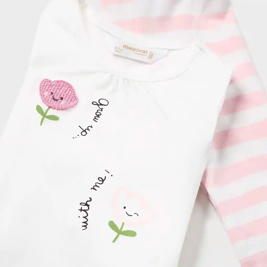 Conjunto 2pz Flor es un set de dos piezas para recién nacido formado por un conjunto de camiseta y pantalón largo. El Conjunto 2pz Flor viene con: Camiseta de manga larga para recién nacido. Cuello redondo. Cierre lateral con botones a presión. Diseño con volante decorativo en el bajo de la prenda. Pantalón tipo legging para recién nacido. Cinturilla elástica. Diseño estampado. Características: CAMISETA MANGA LARGA Exterior 95% Algodón 5% Elastano CUIDADO DE LA PRENDA LEGGINGS Exterior 95% Algodón 5% Elastano CUIDADO DE LA PRENDA