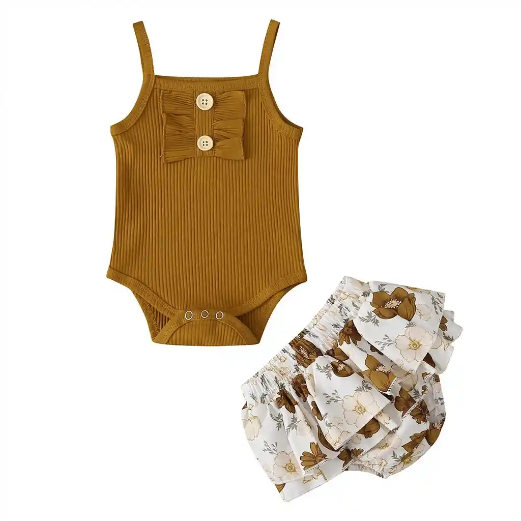 Conjunto en short con boleros en estampado de flores y body café 9-12 Meses