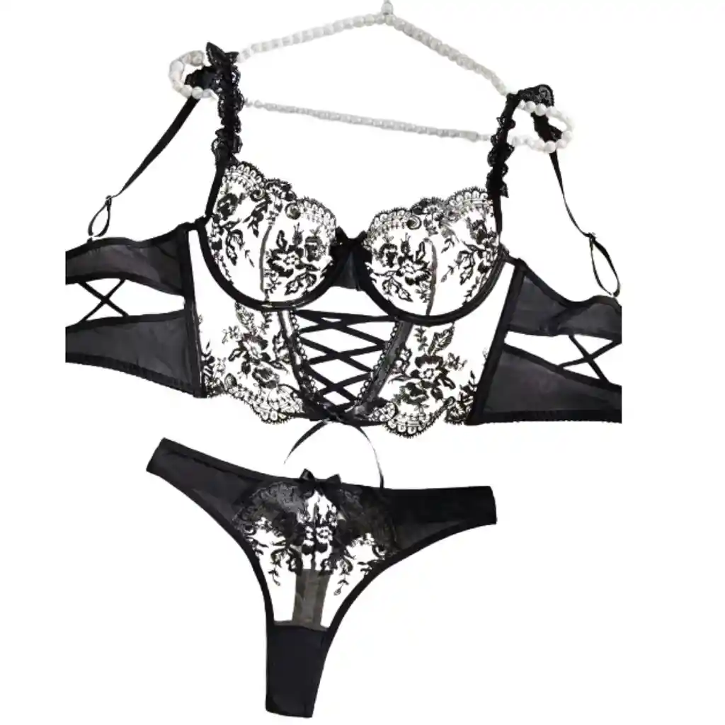 TALLA S Conjunto de lencería femenina de 2 piezas, elegante, sensual y sofisticado. Incluye brasier tipo corset con varillas de soporte, copas estructuradas y delicados detalles en encaje bordado blanco con negro, además de panty tipo tanga a juego. Diseño transparente con malla suave y ajuste cómodo que resalta la silueta de forma femenina y atractiva. Cuenta con tirantes ajustables y acabado fino de alta calidad, ideal para ocasiones especiales, noches románticas o para sentirte segura y hermosa. Un diseño exclusivo que combina delicadeza y sensualidad en una sola prenda.
