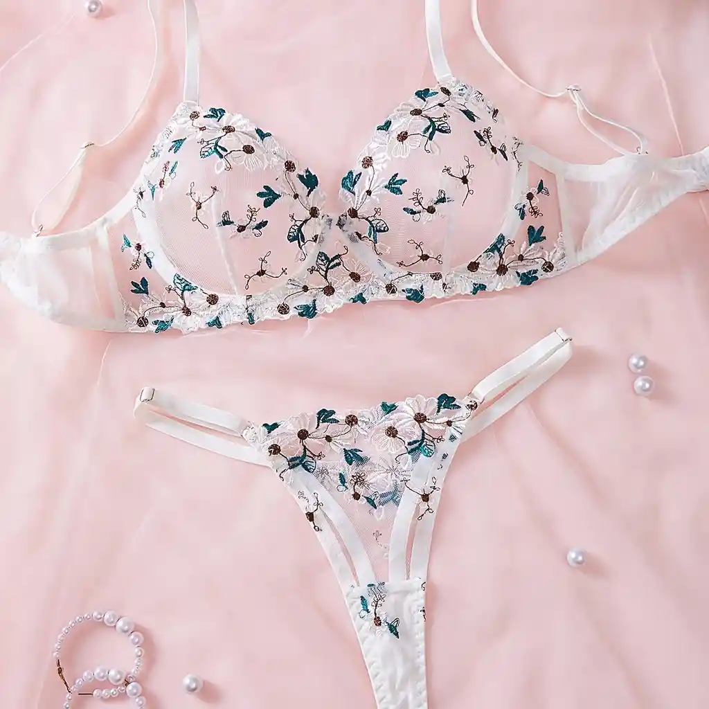 Conjunto de lencería sexy bordada de 2 piezas | Bralette y tanga de malla transparente con diseño