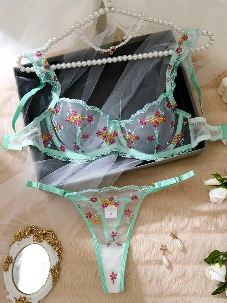 Conjunto de lencería sexy bordada de 2 piezas | Bralette y tanga de malla transparente con diseño