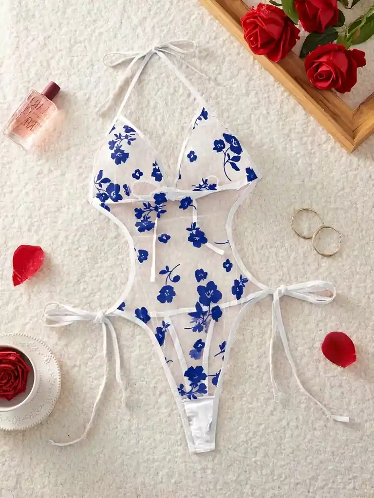 Conjunto de lencería sexy bordada de 2 piezas | Bralette y tanga de malla transparente con diseño