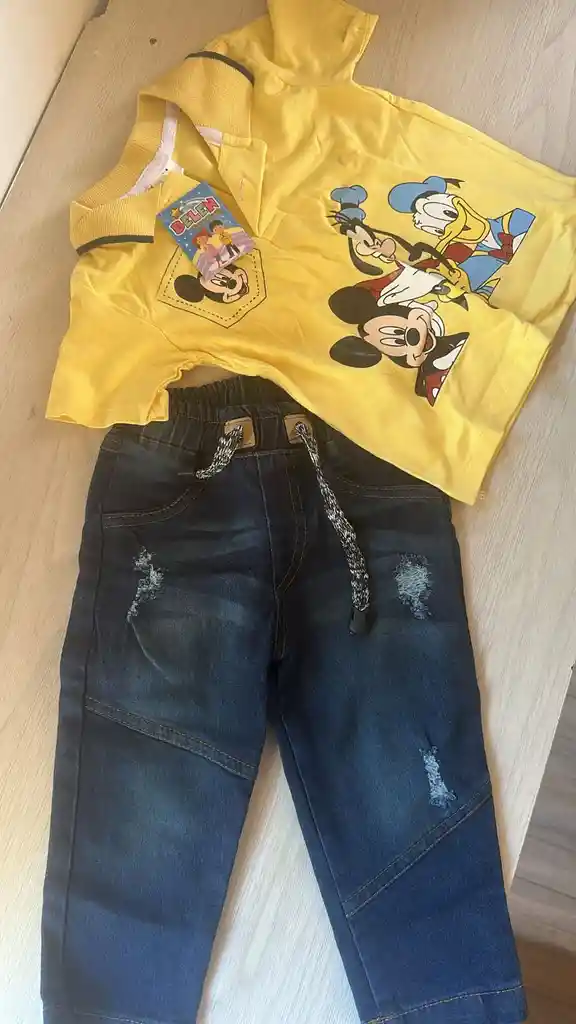 CONJUNTO DOS PIEZAS CON ESTAMPADO DE MICKEY MOUSE CAMISA CON CUELLO REDONDO CON BOTONES JEANS AZUL CON CIERRE DE BOTONES TALLA: 1/2