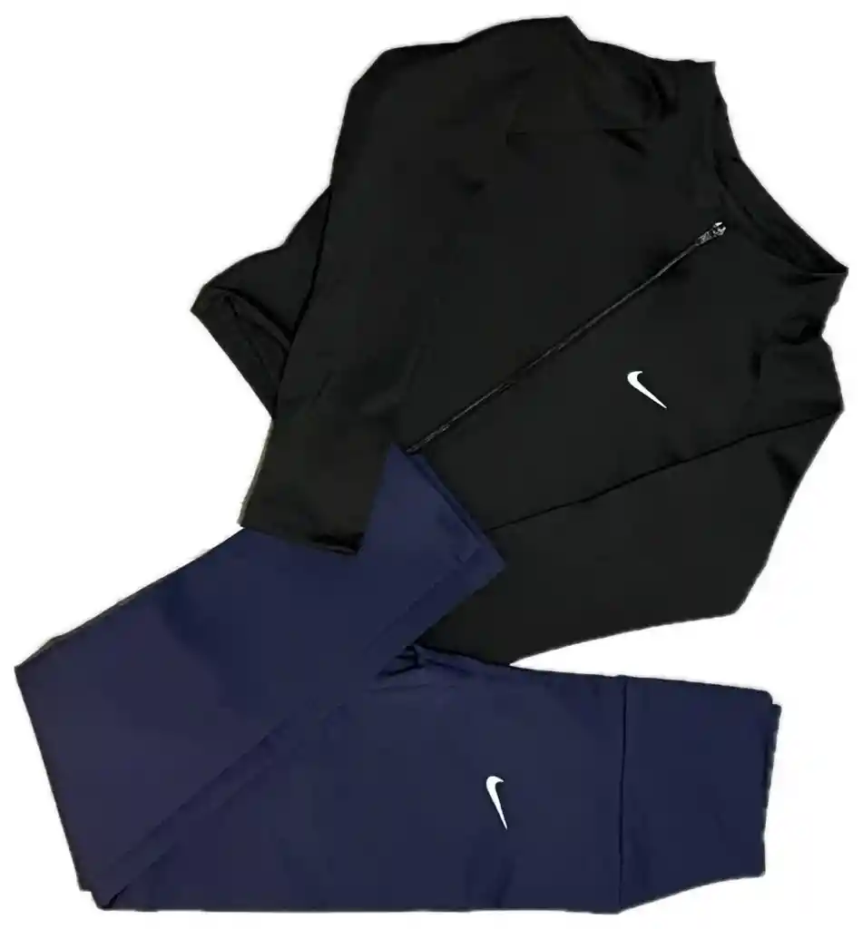 Conjunto deportivo dama, licra azul oscuro y chaqueta negra, material suplex deportivo semirrígido, talla única.