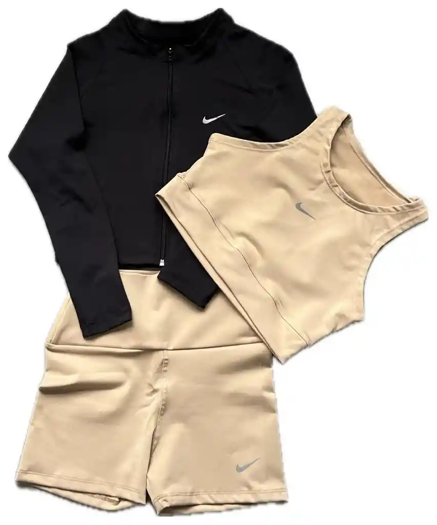 Conjunto deportivo dama, short beige, top beige y chaqueta negra, material suplex deportivo semirrígido, talla única.
