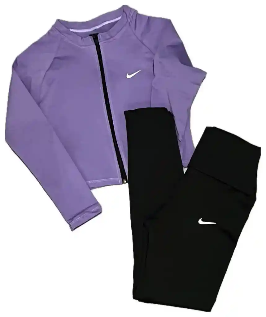 Conjunto deportivo dama, licra negra y chaqueta lila, material suplex deportivo semirrígido, talla única.