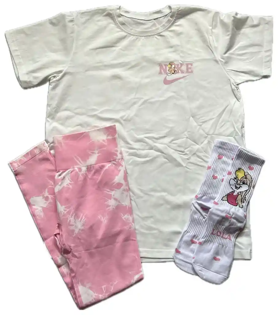 Conjunto deportivo dama: camiseta talla única material poliéster grueso, licra color rosada talla L tie dye y medias talla única.