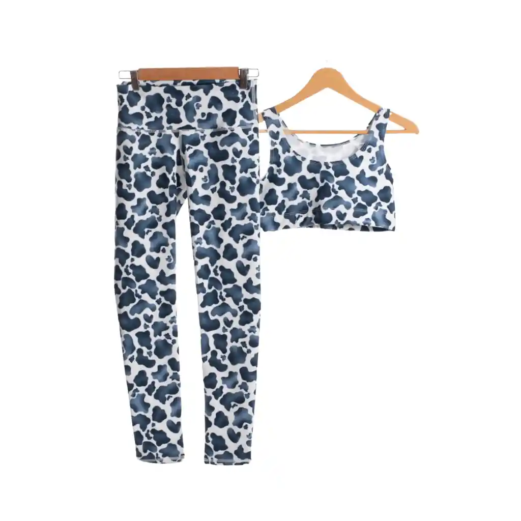 Conjunto deportivo legging y top Manchas Top escote redondo, elástico en la parte inferior para mayor agarre. Espalda amplia que brinda agarre y seguridad. Legging de pretina ancha y alta con control de abdomen. Telas compuestas de microfibras texturizadasy lycra. Talla Unica se adapta a diferentes cuerpos, ceden para talla 6 a 12.