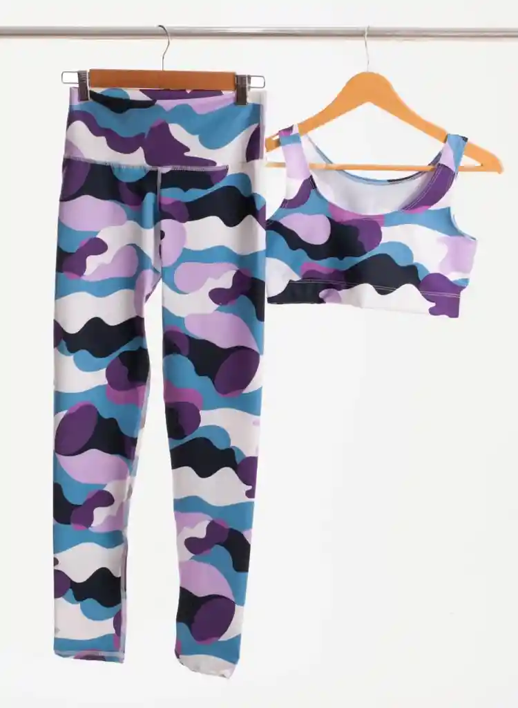 Conjunto deportivo legging y top Morado Azul Top escote redondo, elástico en la parte inferior para mayor agarre. Espalda amplia que brinda agarre y seguridad. Legging de pretina ancha y alta con control de abdomen. Telas compuestas de microfibras texturizadasy lycra. Talla Unica se adapta a diferentes cuerpos, ceden para talla 6 a 12.