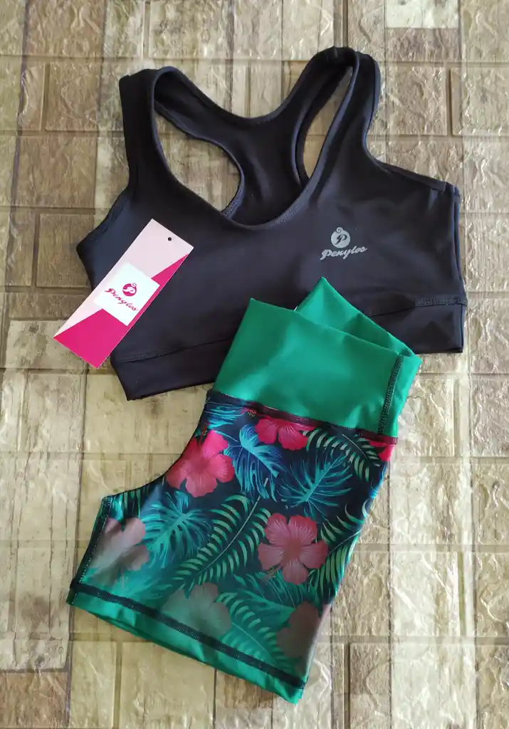 Short sublimado en telas inteligentes, se ajusta perfecto, no descolora, no se motea, talle alto y fajon ancho, y top basico en poliester mas elastano.