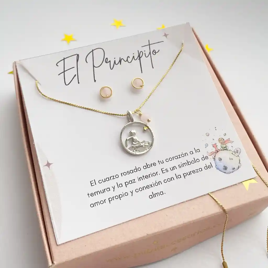 CPC1 Set El Principito ✨ Cuarzo Rosado Lleva la magia y ternura del clásico cuento con este delicado set de joyería, diseñado para recordarte que "lo esencial es invisible a los ojos". Un detalle perfecto con un profundo significado emocional. ¿Qué incluye el set? • Collar de El Principito: Dije circular de El Principito con detalle en Cuarzo rosado natural. • Aretes (Topos): Par de delicados topos de cuarzo rosado natural a juego. • Empaque Especial: Caja de regalo decorativa con tarjeta que detalla el significado de la piedra. Significado del Cuarzo Rosado • El Cuarzo rosado es el símbolo universal del amor y la ternura. • Ayuda a abrir el corazón a la paz interior y la pureza del alma. • Fomenta el amor propio y la conexión con uno mismo. ¡Un regalo inolvidable, listo para entregar y sorprender! 🎁💖