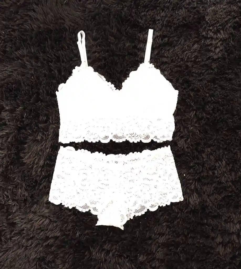 Conjunto en encaje de 2 piezas con Tiras Ajustables diseño delicado Incluye: Brasier + Panty Talla Unica Por Ser ropa íntima No se hacen cambios ni devoluciones después de usados o por cambios en colores o tallas.