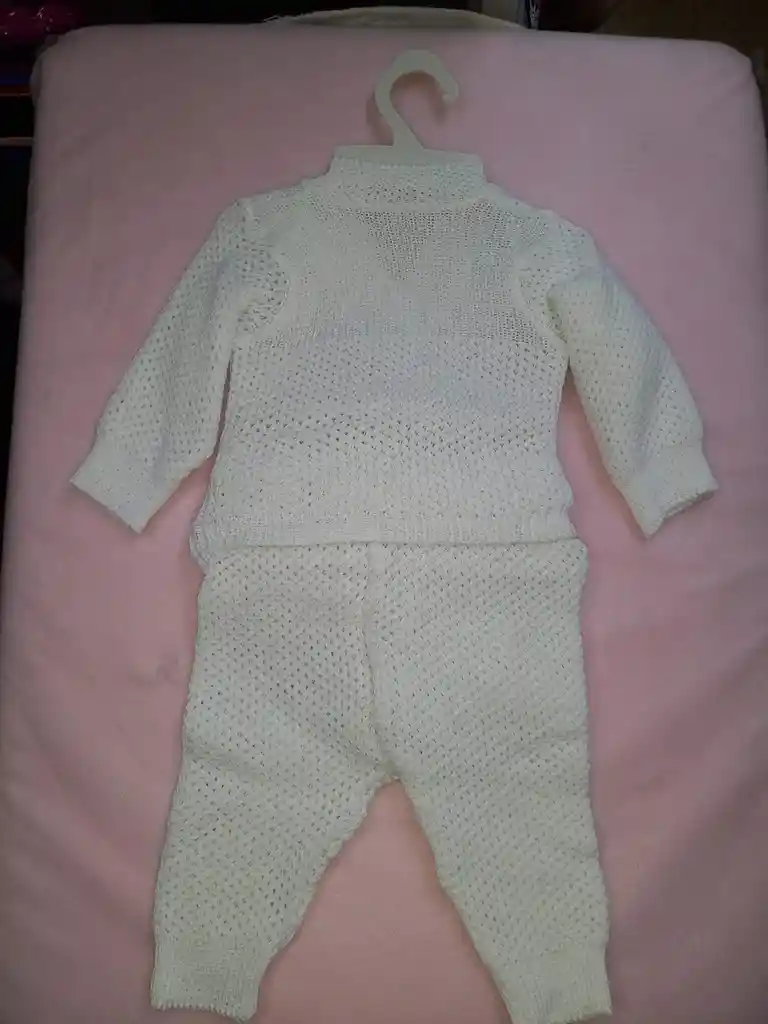 Conjunto en hilo para bebé, unisex, de pantalón, saco, gorro y patines, color blanco.