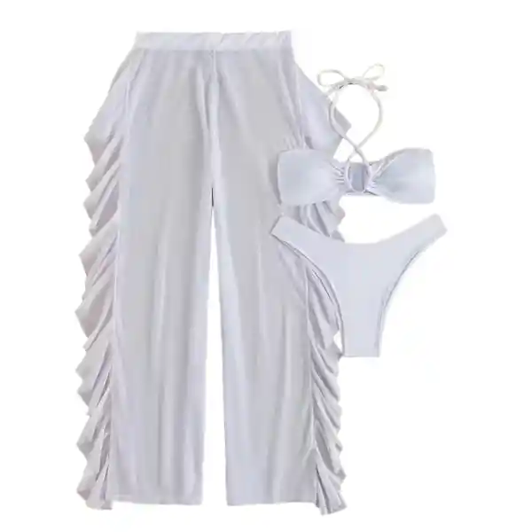 ✨TALLA S Conjunto femenino 3 piezas en color blanco, ideal para looks de playa, piscina o vacaciones. Incluye top tipo bandeau con tiras ajustables, panty tipo tanga de corte moderno y pantalón palazzo fluido con delicados voleros laterales, que aportan movimiento y un estilo elegante. Características: - Conjunto de 3 piezas: top, panty y pantalón - Diseño fresco y sofisticado - Pantalón palazzo de tiro alto con voleros laterales - Tela ligera, suave y cómoda ✨ Ideal para playa, resort, pool party o salidas veraniegas Un outfit versátil y chic que combina sensualidad y elegancia 🤍