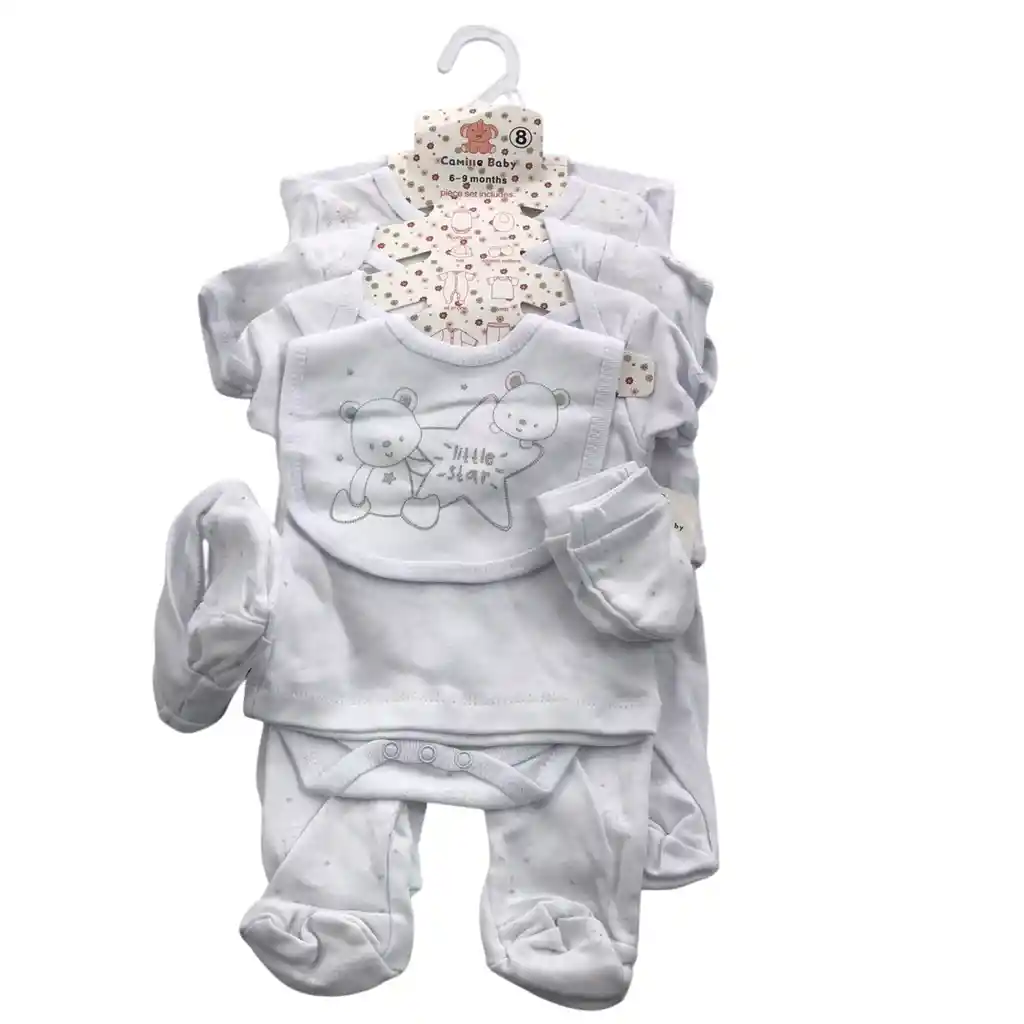 Este conjunto para bebé unisex talla 6-9 meses presenta un diseño en color blanco con estampado delicado de ositos y estrellas en tonos suaves, ideal para un look tierno, neutro y elegante desde los primeros días de vida. El set está confeccionado en tela suave y cómoda, pensada para proteger la piel sensible del recién nacido. Es una opción práctica para el uso diario, el descanso y como regalo de nacimiento. Incluye dentro del conjunto 1 body manga corta 1 babero 1 gorro 2 guantes mitones 1 enterizo 1 camiseta 1 camisa manga larga 1 pantalón con pies cubiertos Este set completo de 8 piezas para bebé 6- 9 meses ofrece abrigo ligero, versatilidad y facilidad al vestir, convirtiéndose en un básico esencial para los primeros meses del bebé.