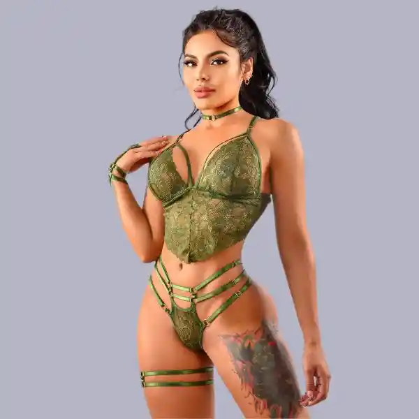 ¡Luce hermosa y atractiva con este conjunto! Una lencería elaborada en encaje, con materiales muy suaves, sexys y elegantes que enmarcan cada parte de tu cuerpo haciéndolas lucir sensuales y delicadas. Esta lencería cuenta con tirantes graduables y es libre de varillas. Incluye un hermoso panty que resalta tu cadera ý abdomen, haciéndote lucir más sexy. • Talla Única Ajustable • Color: Verde oliva. • Incluye: Top, Panty, Liga, Pulsera, Choker. • Hecho en Colombia. Calidad de exportación. Cuidados: Se recomienda lavar por separado, secar a la sombra y no utilizar blanqueador. Confidencialidad: Tus pedidos se envían en una caja o sobre totalmente sellado opaco sin ningún tipo de marcas externas. Para nosotros es muy importante tu privacidad.
