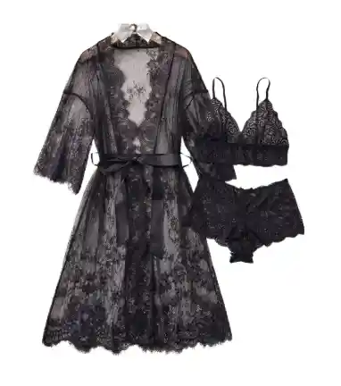 🖤 Set de Lencería 3 Piezas con Bata de Encaje 🖤 Un conjunto que respira lujo, feminidad y sofisticación: 👘 Bata larga de encaje negro con delicados bordes festoneados y cinturón de satén, perfecta para envolver tu silueta con misterio y glamour. 👙 Brassier de encaje con tirantes ajustables, diseñado para realzar el busto con suavidad y estilo. 🩲 Panty a juego en encaje transparente, que completa el look con sensualidad y armonía. ✨ Ideal para noches especiales, sesiones fotográficas o simplemente para sentirte divina. 🎁 ¡Un regalo perfecto para ti o para sorprender con elegancia y pasión!