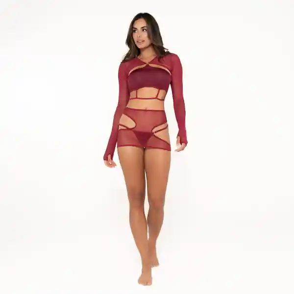 Melisse es el equilibrio perfecto entre sensualidad y estilo. Este conjunto en polilicra vinotinto y malla incluye una falda diseñada para acentuar tus curvas y un top con detalles de corset que realzan tu figura. Ideal para quienes buscan destacar con elegancia.