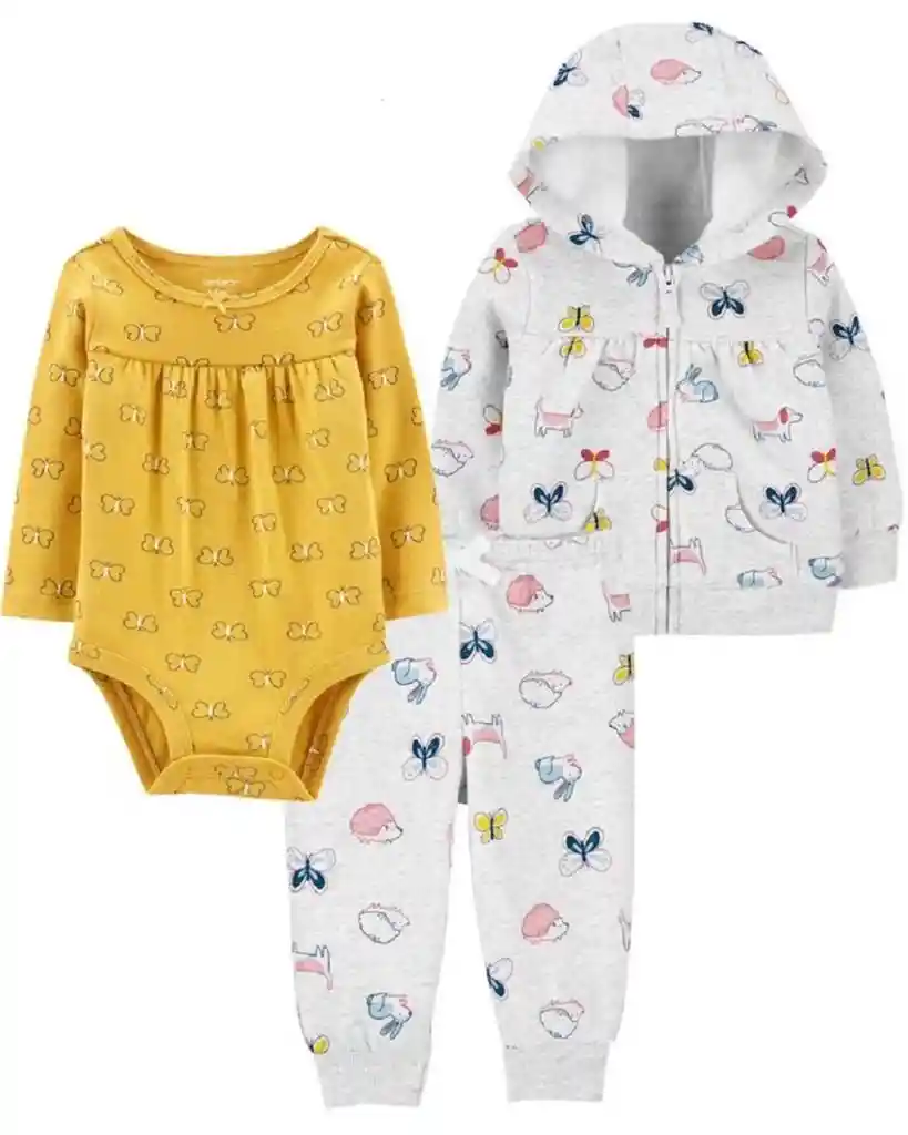Disponible en talla 12m. Hermoso Conjunto 3 piezas para niñas bebé Marca Carter's. Incluye Buzo con capota, un Body manga corta y un Pantalón fabricados en materiales suaves y delicados con la piel de tu bebé, para mantenerlo cómodo y fresco durante todo el día. Luego de realizar tu compra déjanos saber la talla , por el chat o por medio de indicaciones especiales de compra.