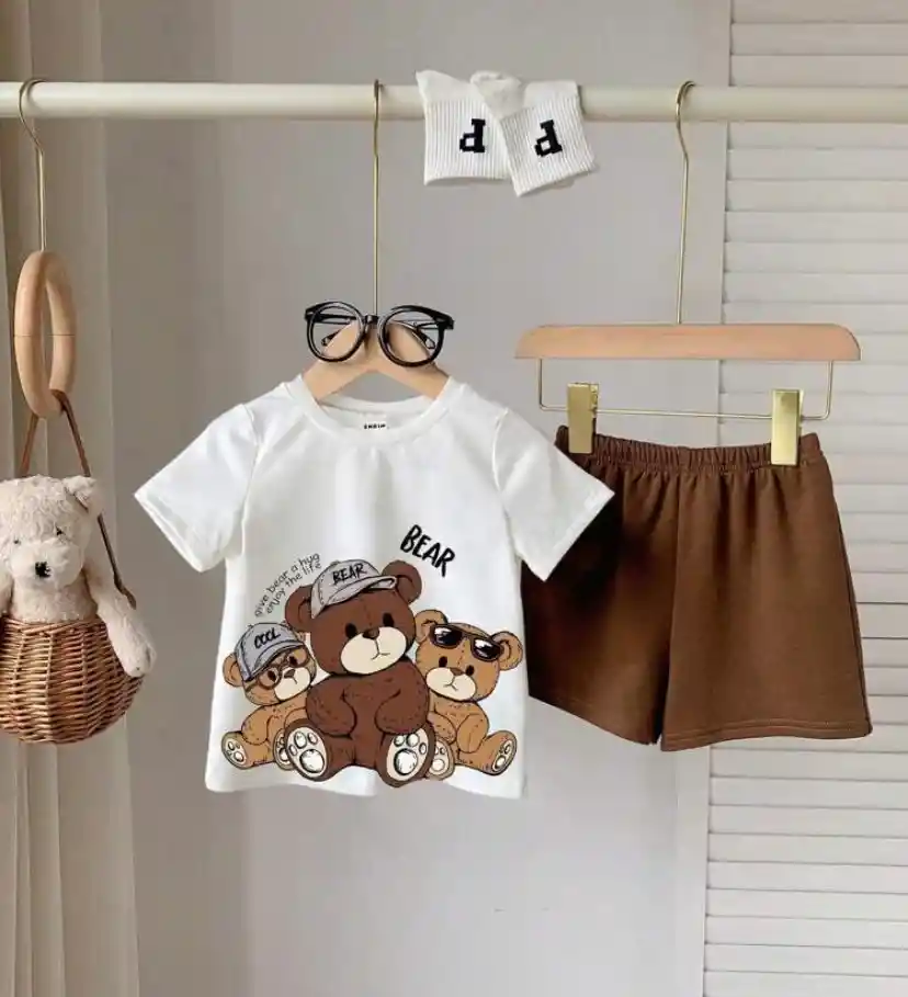Conjunto para bebé niño compuesto por camiseta blanca con adorable estampado de osos y short color café, ideal para uso diario con estilo y comodidad. ✔️ Tela suave y fresca, delicada con la piel del bebé ✔️ Camiseta cómoda, fácil de poner ✔️ Short con elástico en la cintura para mejor ajuste ✔️ Diseño moderno y tierno, perfecto para salidas, fotos o estar en casa Un outfit práctico, lindo y funcional para bebés activos 🧸🤍🤎 Talla 6-9 meses