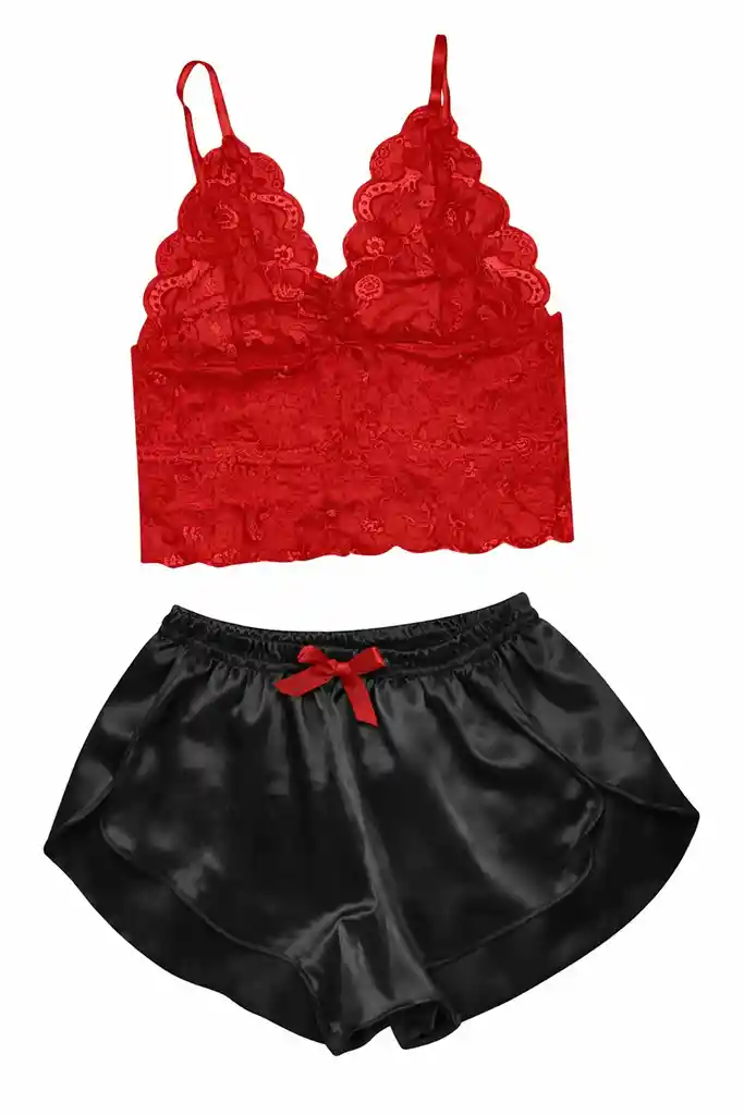 Conjunto Pijama Satin De Lencería Sexy De 2 Piezas Talla Unica Bralette de Encaje transparente con diseño y short en satin