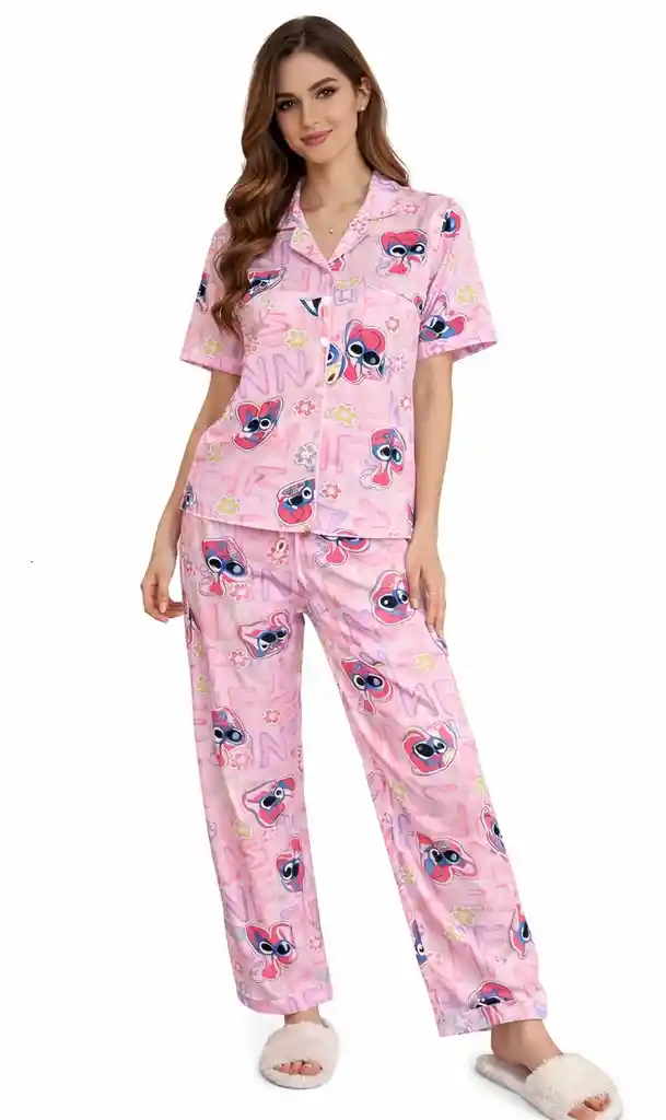 Este conjunto combina elegancia y comodidad. Incluye una blusa camisera con botones y cuello clásico, junto con un pantalón de cintura elástica y corte relajado. Confeccionado en tejido suave y transpirable, es perfecto para dormir o relajarte con estilo. Disponible en colores y estampados modernos, es ideal para tus momentos de descanso.