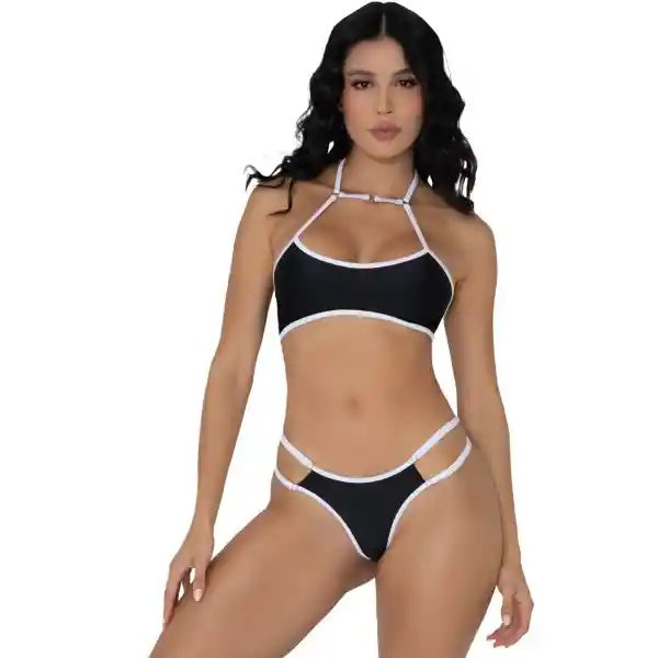 Este atrevido diseño, en un profundo negro que evoca misterio y elegancia, está meticulosamente adornado con bordes blancos que añaden un toque de contraste y sofisticación. La silueta favorecedora abraza las curvas con gracia, mientras que los detalles cuidadosamente elaborados realzan la figura con un aire de refinamiento y distinción. CARACTERÍSTICAS: Material: Nylon 75%, Elastane 25% Color: Negro Incluye: Top y Panty CUIDADOS: por su material requiere que sea lavado a mano usando agua fría y secado a la sombra, tenga en cuenta que al ser una prenda delicada no se recomienda el uso de desinfectantes o planchas.
