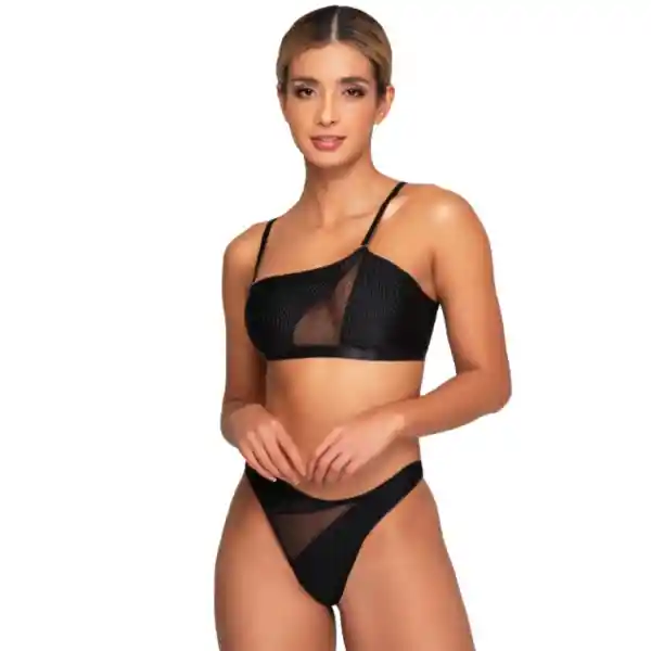 diseñado para destacar la silueta con un look contemporáneo y sensual. La licra suave y elástica se adapta cómodamente al cuerpo, mientras que el diseño asimétrico del top aporta un toque moderno y audaz que realza el busto de forma favorecedora. Un conjunto versátil y cómodo, ideal para quienes buscan una lencería diferente, elegante y con personalidad, perfecta para ocasiones especiales o para elevar tu colección íntima con un diseño único. CARACTERÍSTICAS: Material: Nylon 75%, Elastane 25% Talla: Única Color: Negro Incluye: top, panty. CUIDADOS: por su material requiere que sea lavado a mano usando agua fría y secado a la sombra, tenga en cuenta que al ser una prenda delicada no se recomienda el uso de desinfectantes o planchas.