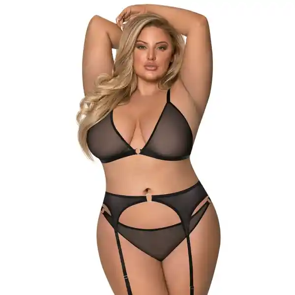 Diseñado para resaltar tus curvas con sensualidad y seguridad. Sus delicadas transparencias aportan un look atrevido y sofisticado, mientras que el liguero realza la silueta y estiliza el cuerpo de forma favorecedora. Confeccionado para ofrecer un ajuste cómodo y adaptarse perfectamente a cuerpos plus size, este conjunto combina diseño, feminidad y confianza. Ideal para ocasiones especiales o para sentirte poderosa y hermosa en cada detalle. CARACTERÍSTICAS: Material: Nylon 75%, Elastane 25% Talla: Única plus Color: Negro Incluye: top, panty y liguero. CUIDADOS: por su material requiere que sea lavado a mano usando agua fría y secado a la sombra, tenga en cuenta que al ser una prenda delicada no se recomienda el uso de desinfectantes o planchas.