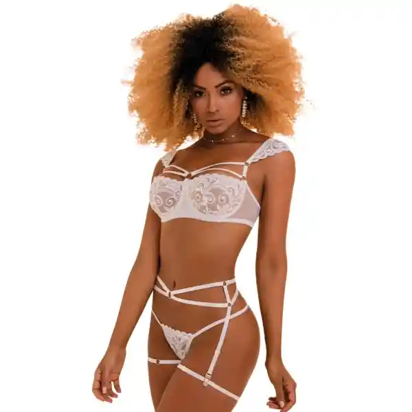 Este conjunto de lencería combina la delicadeza del encaje con un diseño que despierta la pasión. Incluye un bralette suave y romántico, un panty a juego, y un elegante liguero con ligas que enmarcan tus curvas con una sensualidad sutil pero poderosa. CARACTERÍSTICAS: Material: Nylon 75%, Elastane 25% Color: Blanco Incluye: top, hilo, liguero y ligas. CUIDADOS: por su material requiere que sea lavado a mano usando agua fría y secado a la sombra, tenga en cuenta que al ser una prenda delicada no se recomienda el uso de desinfectantes o planchas.