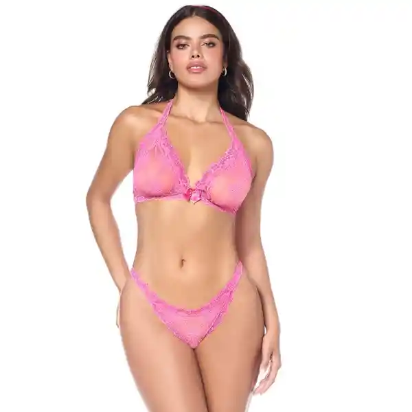 Un set ideal para quienes buscan un equilibrio entre ternura y sensualidad en cada momento. Incluye un bralette en encaje floral semitransparente con amarre al cuello y lazo en la espalda, que aporta un ajuste cómodo y seductor. La panty a juego, resalta la silueta con un toque romántico y provocador. CARACTERÍSTICAS: Material: Nylon 75%, Elastane 25% Color: Rosado Incluye: top, hilo CUIDADOS: por su material requiere que sea lavado a mano usando agua fría y secado a la sombra, tenga en cuenta que al ser una prenda delicada no se recomienda el uso de desinfectantes o planchas.