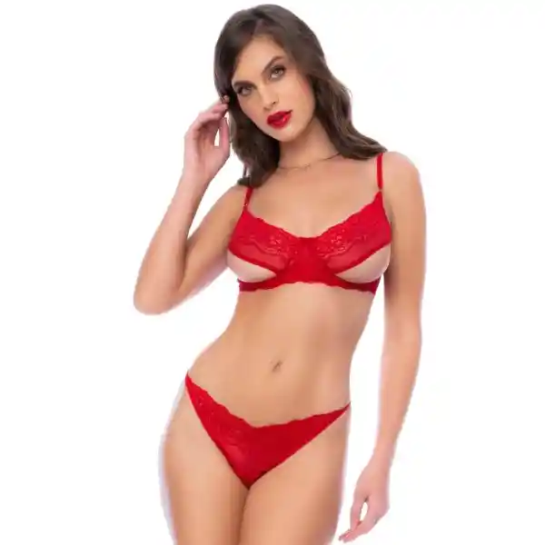 Set de dos piezas en encaje. Top con varilla y copas semi abiertas, cargaderas ajustables y tanga a juego. CARACTERÍSTICAS: Material: Nylon 75%, Elastane 25% Color: Rojo Incluye: top, hilo CUIDADOS: por su material requiere que sea lavado a mano usando agua fría y secado a la sombra, tenga en cuenta que al ser una prenda delicada no se recomienda el uso de desinfectantes o planchas.