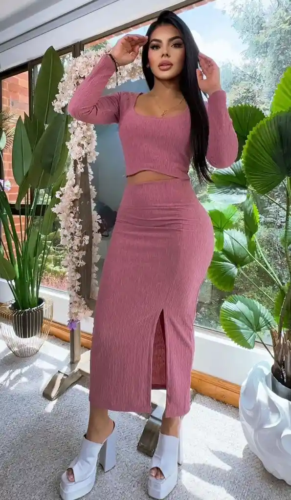 Conjunto Zaragoza – Color Guayaba: Frescura y Curvas Impacta con el vibrante tono guayaba de nuestro conjunto Zaragoza. Diseñado para abrazar tu silueta, este set de dos piezas combina un crop top de manga larga con una falda midi de tiro alto y apertura frontal, creando un look femenino, moderno y lleno de actitud. Su textura acanalada premium garantiza un ajuste perfecto y cómodo. Color: Guayaba vibrante. Detalles: Escote redondo, manga larga y falda con abertura central. Ocasión: Perfecto para una salida especial o un evento de día.