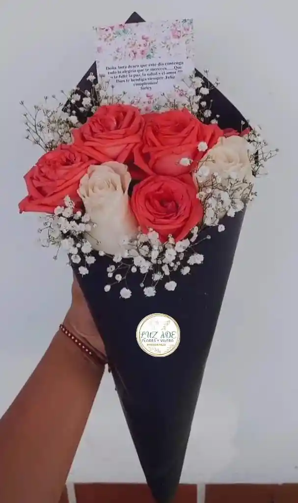 hermoso arreglo floral en cono de base con follaje