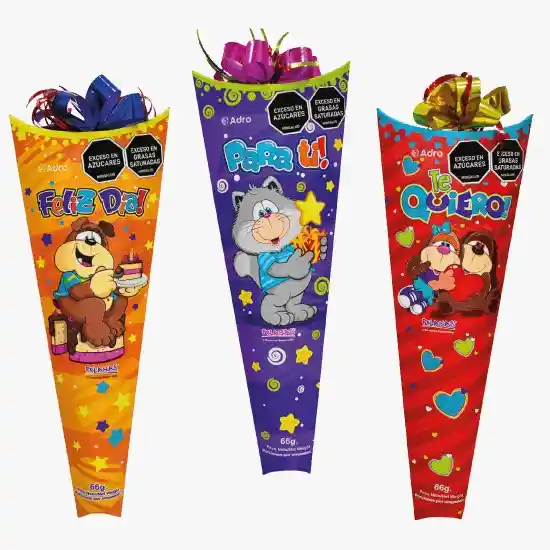 Endulza cualquier momento con este divertido cono artesanal de la marca Adro que contiene una deliciosa selección de chocolates surtidos ideal para regalar un detalle espontáneo y lleno de sabor porque cada unidad presenta un diseño colorido con personajes animados y mensajes especiales como feliz día para ti o te quiero resaltando que el motivo del empaque puede variar según disponibilidad manteniendo siempre la excelente calidad que garantiza una experiencia dulce perfecta para fiestas infantiles o un pequeño gesto de afecto que se convierte en el complemento de piñatería ideal para sorprender a niños y adultos por igual en cualquier celebración temática.