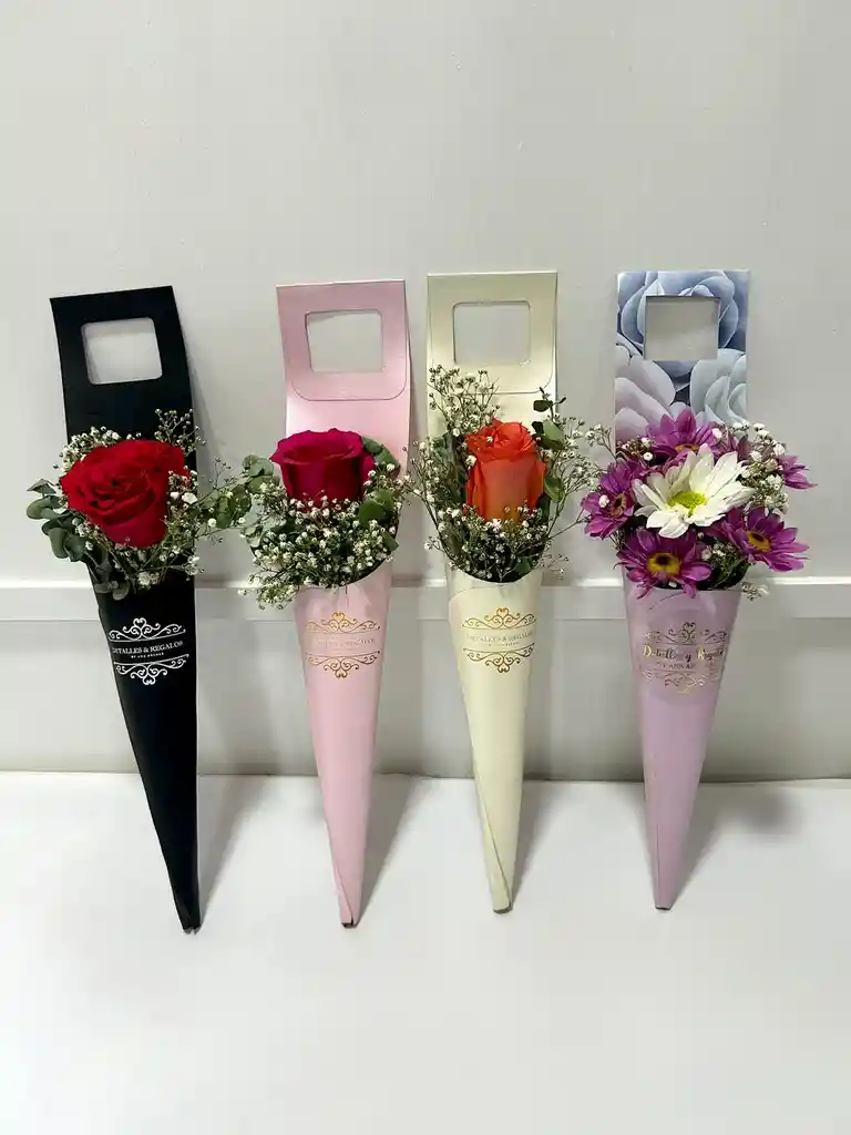Cono solitario de una rosa (Color del cono a disponibilidad, aún así informar color de preferencia (Rosado, Champagne, Lila, negro)