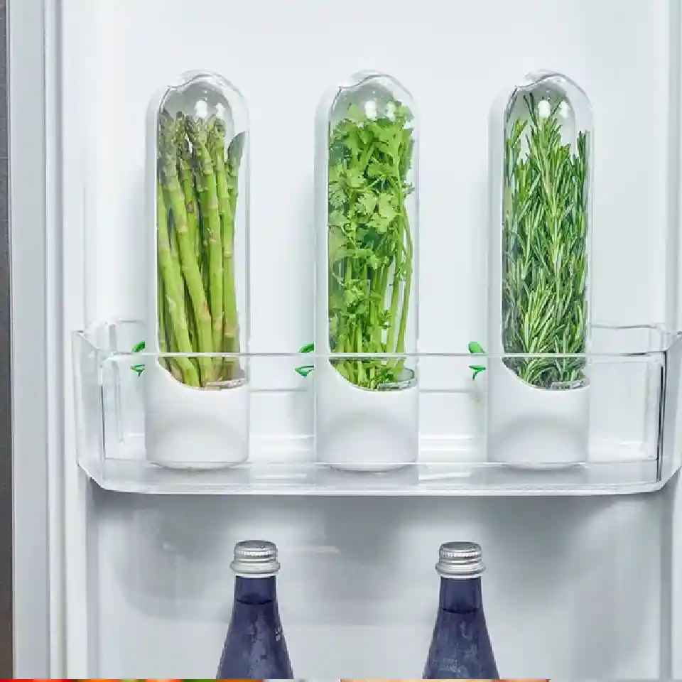 Enjuague sus hierbas y/o vegetales. Colóquelos en la vaina de hierbas y agregue un poco de agua fresca a través de la tapa de relleno de levadura. Recuerda vaciar el agua vieja y rellenar cada 3 a 5 días y las hierbas estarán frescas hasta por 3 semanas Esta botella de conservación de vegetales frescos tiene buena integridad hermética, puede mantener la humedad y fresco de verduras y hierbas. (Nota: Solo sumerja los tallos en agua para evitar el remojo a largo plazo de las verduras debido al exceso de agua)