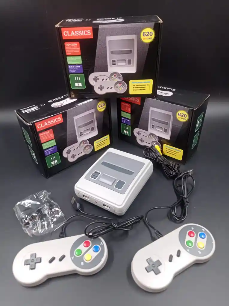 La consola Súper Mini NES cuenta con: 🌟620 juegos retro incorporados de NES y Family. 🌟Dos controles. 🌟Cable de audio y vídeo para conectarla al televisor.