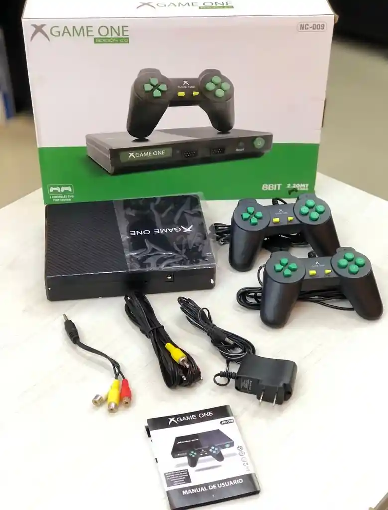 Contiene los mas emocionantes y divertidos juegos totalmente interactivos para todas las edades, contiene 200 juegos incorporados como circus, pacman 3, super contra, Ice climber, super contra, entre otros. Incluye 2 controles tipo play (2.20metros) 1 consola 1 adaptador de corriente (cable 2.20 metros) 1. cable de audio y video largo (cable 2.40 metros) 1. cable componente de audio y video 1. Manual de instrucciones
